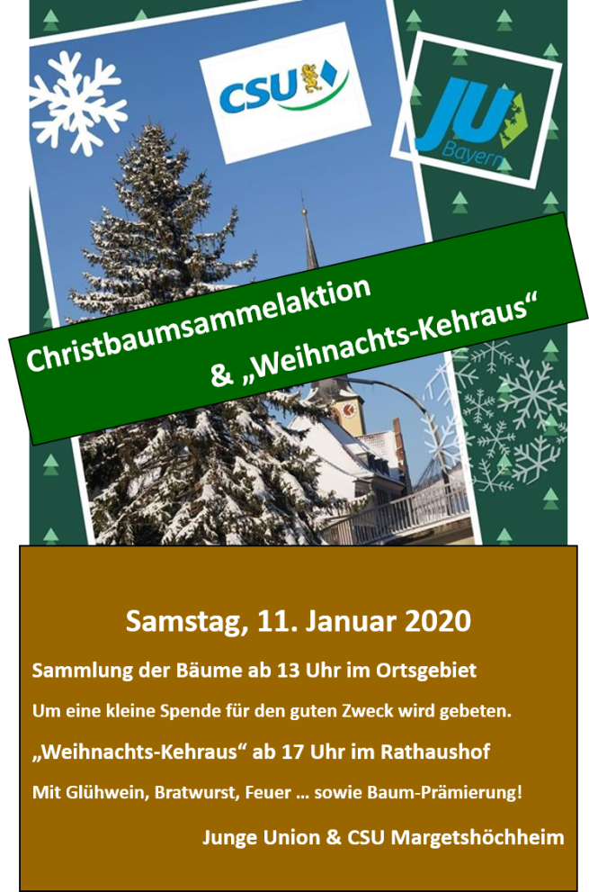 Die Bäume werden ab 13 Uhr eingesammelt. Herzliche Einladung zum Weihnachts-Kehraus ergeht ab 17 Uhr im Rathaushof.