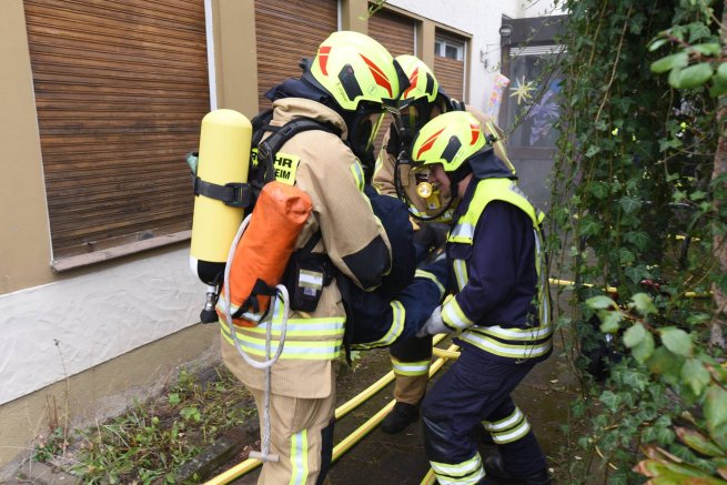 Schon kurz nach dem Eintreffen der Feuerwehren Margetshöchheim und Erlabrunn konnten die ersten Personen mittels Steckleitern von einem Balkon gerettet und in Sicherheit gebracht werden. Rasch war eine Wasserversorgung, sowohl vom Main, als auch von der Gartenstr. aus hergestellt und die eingesetzten Atemschutztrupps konnten zur Personenrettung in das zu Übungszwecken vollständig verqualmte Gebäude vordringen.