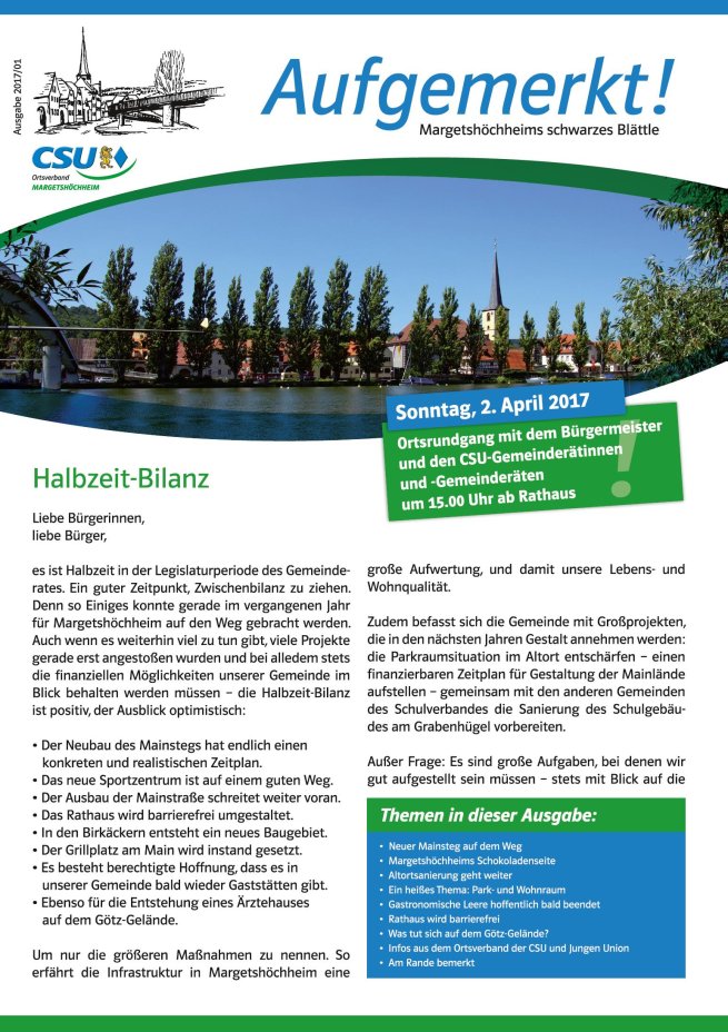 Außerdem laden wir herzlich zum Austausch bei unserem Ortsrundgang mit dem Bürgermeister und den CSU-Gemeinderäten am Sonntag, 2. April um 15 Uhr ab Rathaus ein.