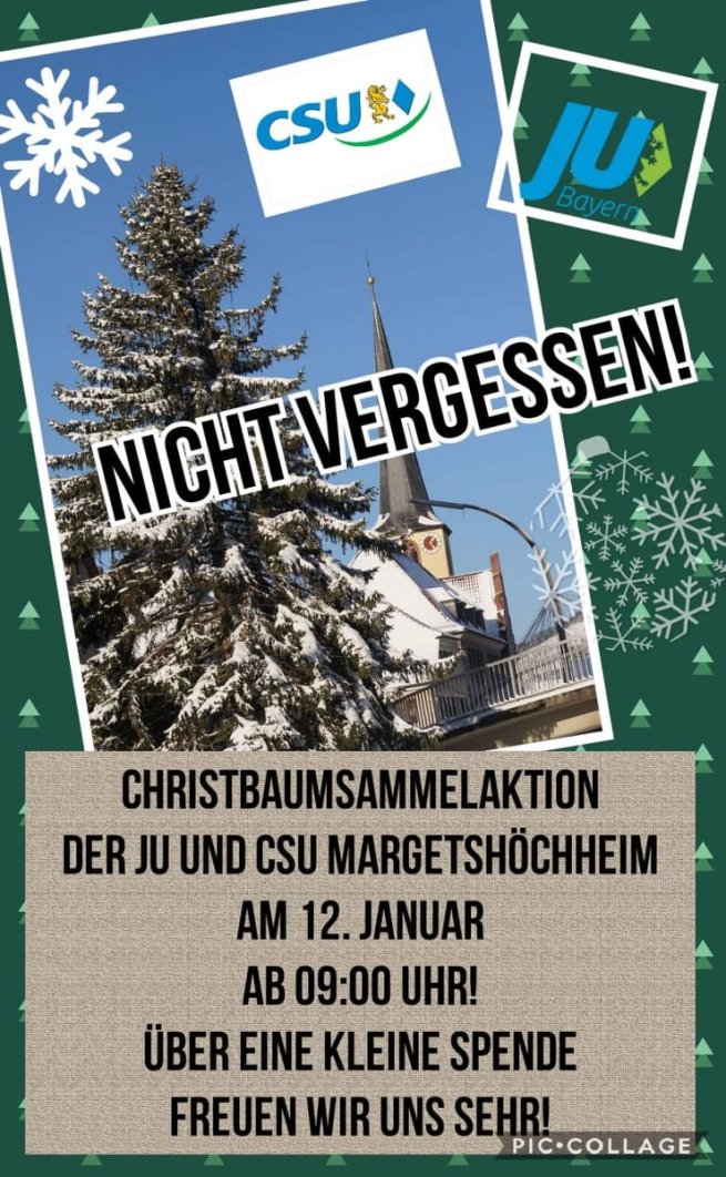 Junge Union und CSU sammeln am Samstag, 12.01.2019 wieder Ihren gebrauchten Christbaum ein. Bitte legen Sie Ihren Baum gut sichtbar ab 8 Uhr an den Straßenrand. Über eine kleine Spende, welche wir für einen karitativen Zweck verwenden und aufrunden wollen, würden wir uns sehr freuen.