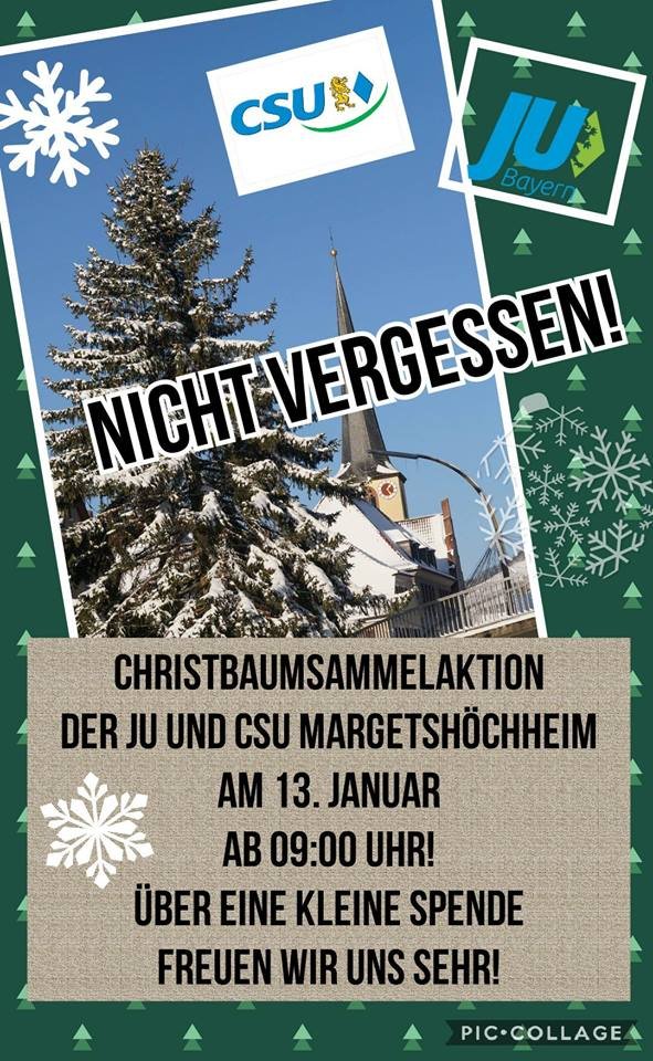 Im vergangenen Jahr waren wir wohl mit der Sammelaktion unmittelbar nach Dreikönig etwas zu früh dran. Dieses Jahr lassen wir etwas mehr Zeit beim Abräumen der Christbäume ;-) gerne holen wir Ihren Christbaum am Samstag, 13.01.2018 bei Ihnen ab.