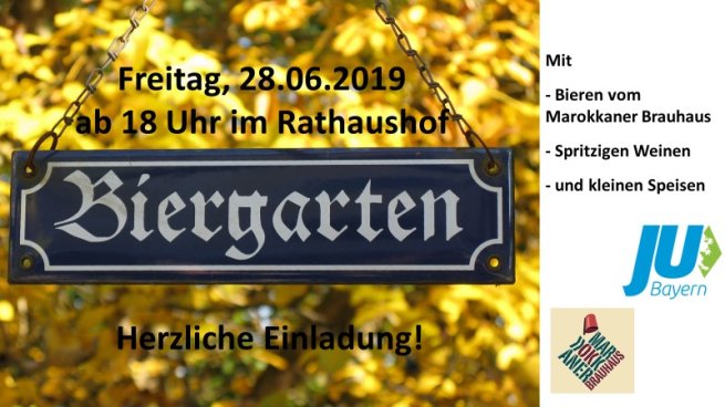 Die Junge Union möchte ganz herzlich zu ihrem Biergarten am Freitag, 28.06.2019 ab 18 Uhr in den Rathaushof einladen.