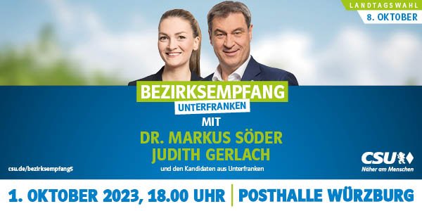 Wir laden Sie zu einem gemeinsamen Abend mit unserem Ministerpräsidenten und Parteivorsitzenden Dr. Markus Söder, MdL, der Bayerischen Staatsminister für Digitales Judith Gerlach, MdL, Landtagskandidatin Dr. Andrea Behr, Landtagskandidat Bgm. Björn Jungbauer, Bezirksrätin Dr. Hülya Düber und Bezirksrätin Rosa Behon sowie den Kandidaten aus Unterfranken für die Landtags- und Bezirkstagswahl 2023 ein.