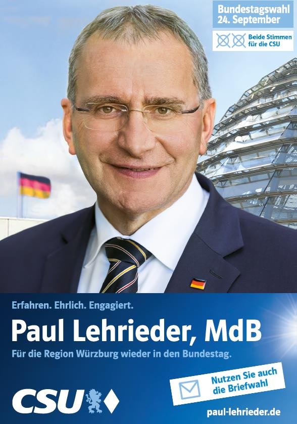 ** **im Hof zwischen Kirche und Pfarrheim mit fränkischen Spezialitäten & Musik und MdB Paul LehriederDie Bundestagswahl steht vor der Türe und damit einmal mehr eine wegweisende Entscheidung für unser Land. Deutschland steht vor großen Herausforderungen – ob in Wirtschafts- und Umweltpolitik, Außen- und Europapolitik, ob bei Bildung, Digitalisierung und gesellschaftlicher Integration – um die großen Schlagworte zu nennen. Verlässlichkeit, Sicherheit und Stabilität sind Kernanliegen der Bürgerinnen und Bürger. Dafür stehen Joachim Herrmann als Spitzenkandidat der CSU und Angela Merkel als unsere Bundeskanzlerin.