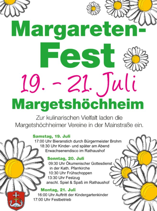 Das absolute Highlight des Margetshöchheimer Jahreskalenders steht vor der Tür - unser Margaretenfest. Drei schöne Tage am Main vielen leckeren und tollen Angeboten. Wir freuen uns.