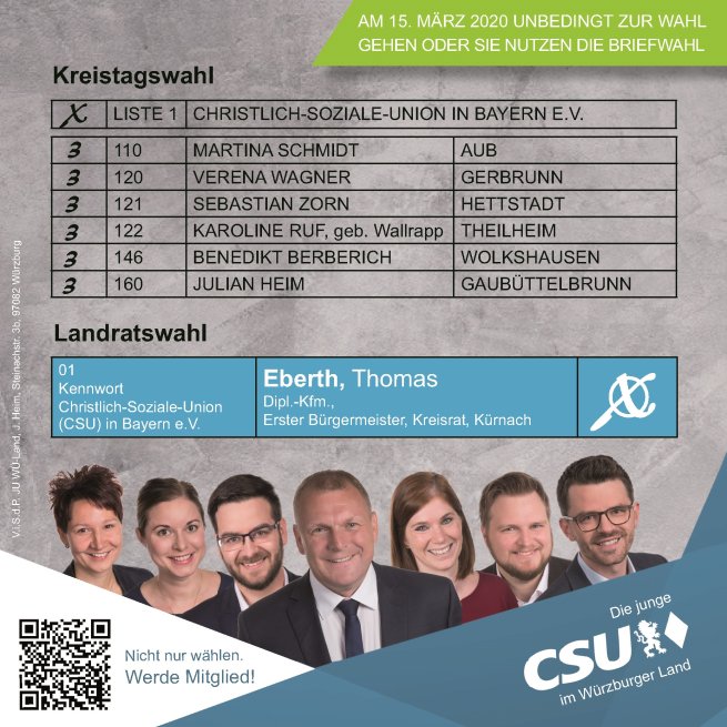 Für die CSU Margetshöchheim kandidieren Waldemar Brohm und Björn Jungbauer erneut. Aber es sind noch einige andere in Margetshöchheim bekannte Gesichter für die CSU am Start - auch mit neuem Nachnamen dank Heirat ;-): Christiane Lurz, geborene Brohm. Weitere junge BewerberInnen siehe oben. Es ist gewiss sinnvoll bei 70 vorhandenene Stimmen, die Margetshöchheimer KandidatInnen in besonderer Weise zu unterstützen.
