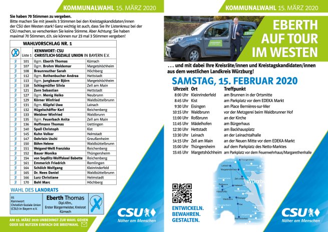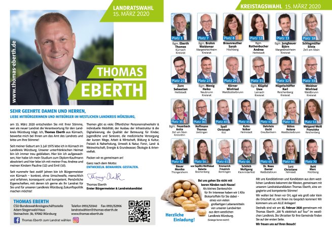 Unser Kandidat Thomas Eberth für den Landrat wird am Samstag, 15.02.2020 um 15.45 Uhr an der Margarethenhalle zu Gast sein. Herzliche Einladung zum Gespräch mit ihm. Mit dabei werden auch die Kandidaten für den Kreistag aus der Umgebung sein. Aus Margetshöchheim kandidieren wieder Waldemar Brohm und Björn Jungbauer. Bitte unterstützen Sie unsere heimischen Kandidaten. Denn davon profitiert gewiss Margetshöchheim.