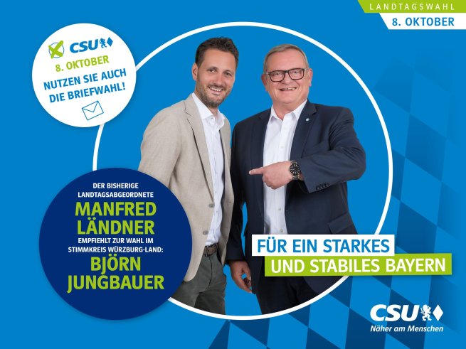 Für Bayern ist die CSU nach wie vor unangefochten und im Gesamten die Partei der gesellschaftlichen Mitte und das soll sie auch bleiben. Zwei Personen, die gerade für die positiven Eigenschaften stehen, sind zum einen Manfred Ländner, der den Landkreis Würzburg in den vergangenen 15 Jahren in München herausragend vertreten hat, stets die Sache, nicht sich im Blick hat(te) und nun aus dem Landtag ausscheiden wird.
