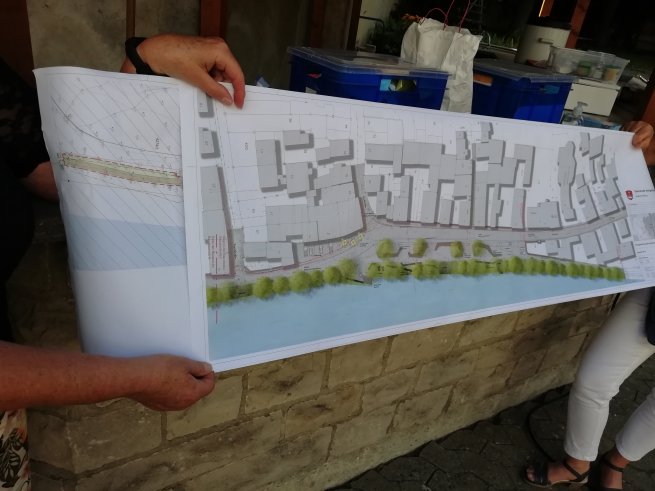 Zunächst ging es bei unserem traditionellen Bürgerspaziergang um die aktuellen Themen in der Margetshöchheimer Ortspolitik - von Schule und KiTa über Wasserversorgung und Baugebiet Scheckert/Lausrain zu den Gemeindefinanzen und einer Begehung der Mainlände, welche zwischen Rathaus und neuem Mainsteg nach und nach umgestaltet wird. Die Planungen des I. Bauabschnitt, welcher der verkehrstechnischen wie ortsintegrativen Erschließung des Areals zwischen Steinernem Weg und neuem Mainsteg gilt, sind schon recht weit vorangeschritten. Zum einen werden hier Fußgänger wie Radfahrer in Zukunft getrennte Wege gehen können. Zum anderen wird das Areal, das so genannte grüne Band am Main, maßvoll und punktuell im nördlichen Abschnitt mit Sitzgelegenheiten, Zugang zum Main, einigen Spielgeräten und Kunstwerken aufgewertet, während der größte Grünflächenanteil unberührt bleibt. Dies scheint ein guter Mittelweg aus den ersten vorlegten Planungsideen zu sein, um einerseits Aufenthaltscharakter - ob zum Sitzen und Verweilen oder Spielen am Main - zu schaffen und anderseits den naturnahen Charakter der Fläche zu erhalten. Natürlich kosten die Maßnahmen Geld und die Summe ist mit ca. 1,1 Mio Euro wirklich nicht unerheblich, wie Bürgermeister Waldemar Brohm und die Teilnehmer des Rundgangs feststellten. Doch geht es eben zum einen um Sicherheit an der Stelle, zum anderen um die notwendige Integration eines bisher vernachlässigten Gebiets, das jedoch durch die Lage des neuen Mainstegs massiv an Bedeutung gewinnen wird. Ohne die zugesagte, stolze 80-prozentige (!) Förderung der Baukosten durch die Regierung wäre der Abschnitt kaum zu stemmen bzw. unverhältnismäßig für die Gemeinde. Das muss man auch konstatieren.