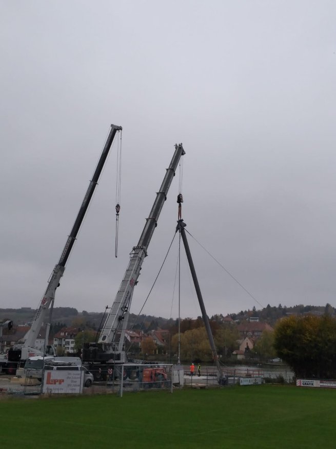 Seit vergangenen Freitag ist nun auch überirdisch schwerstes Gerät im Einsatz, um die zukünftigen Träger des Mainstegs aufzurichten. Es lohnt sich, mal einen Abstecher an der Baustelle zu machen und zuzuschauen.